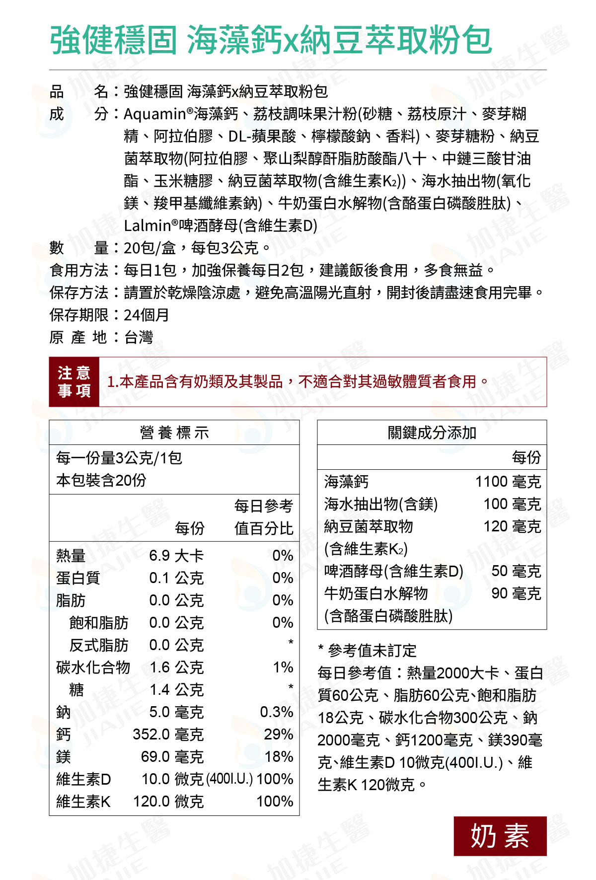 關鍵成分:海藻鈣、海洋鎂、納豆萃取(含維生素K)、酵母維生素D、CPP